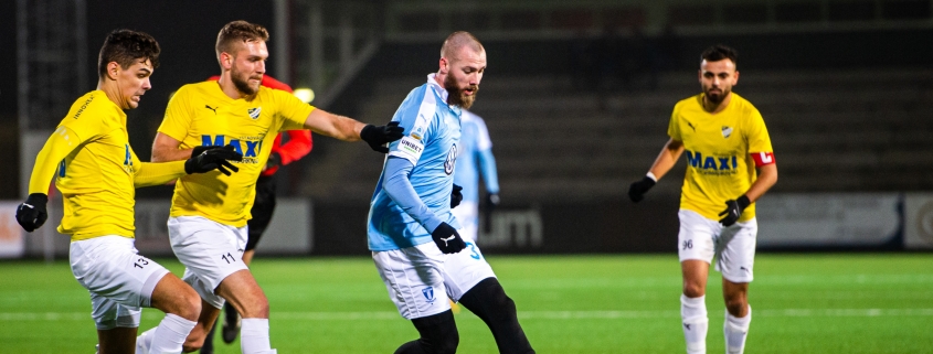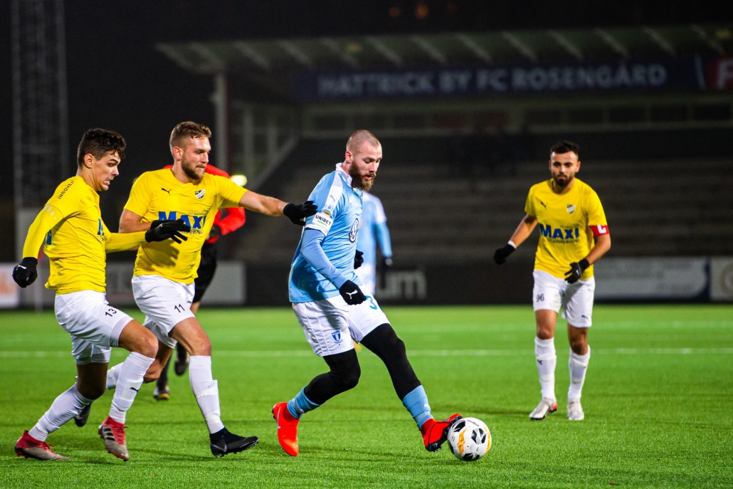 Oskar Zubac (tvåa från vänster) i kamp med Malmö FF:s Jo Inge Berget. Foto: Christoffer Borg Mattisson/Bildbyrån 2020