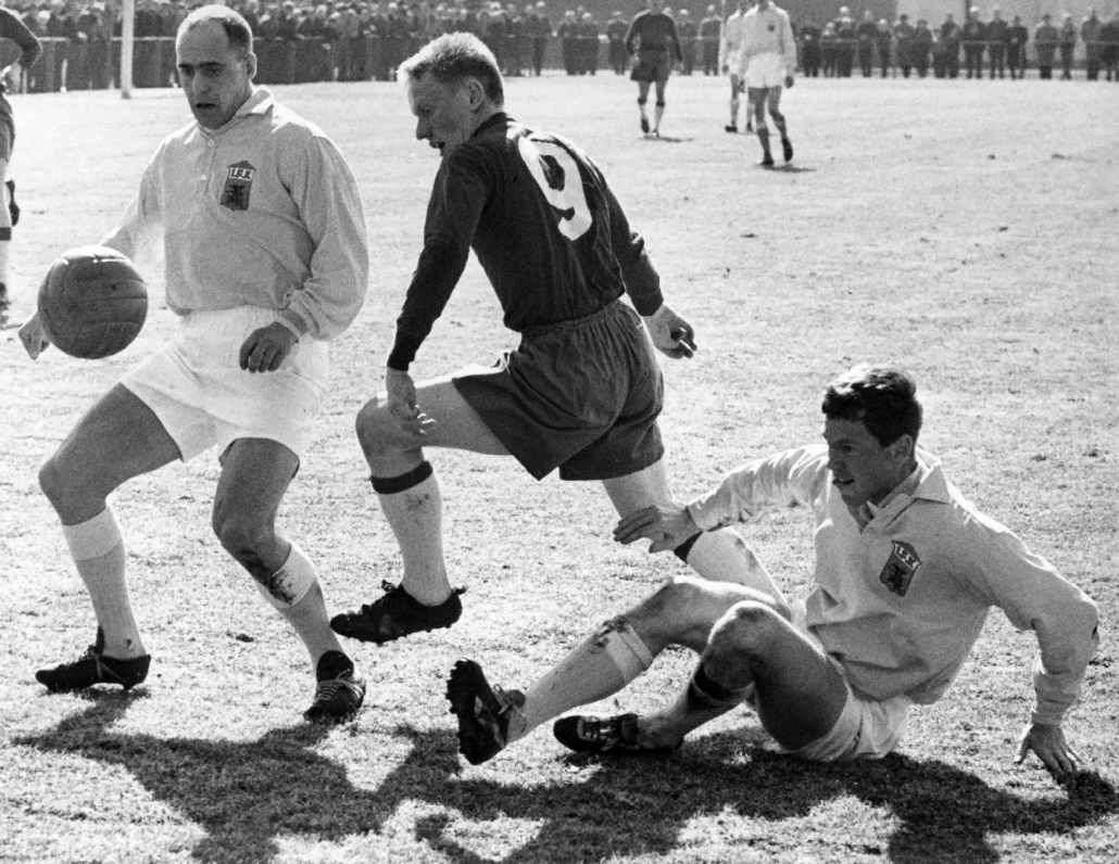 Ulf Nilsson är steget före Ingvar “Knislinge” Persson i Hälsingborgs IF. Nilssons lagkamrat Börje Axelsson ligger ner i träningsmatchen som HIF vann med 3-1. Foto: Sydsvenskan/Bilder i Syd 1963