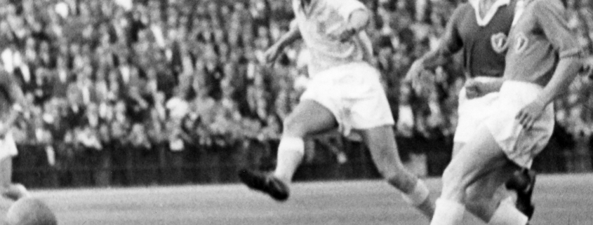 Driv i steget när Bo Borg försöker hålla undan för en Rapidspelare i Europacupkvartsfinalen på Malmö Stadion. Foto: Ernst Henriksson/Sydsvenskan/Bilder i Syd 1961