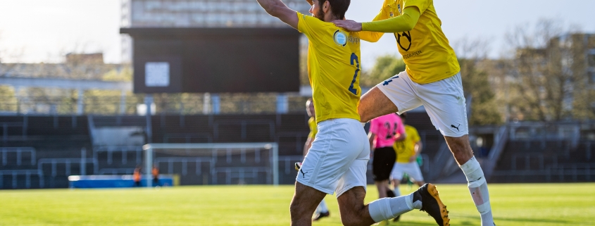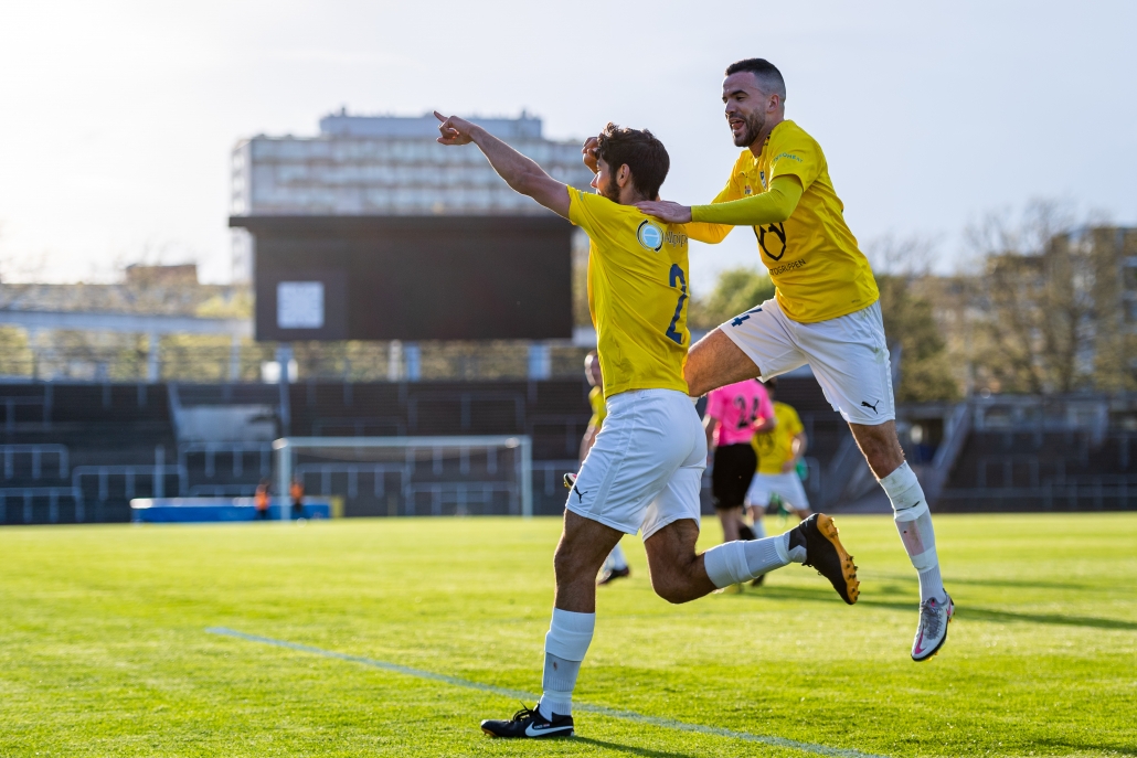 Målskytten Geronimo Balint jublar tillsammans med Granit Stagova efter att ha gjort 2-1 för IFK Malmö. Foto: Christoffer Borg Mattisson