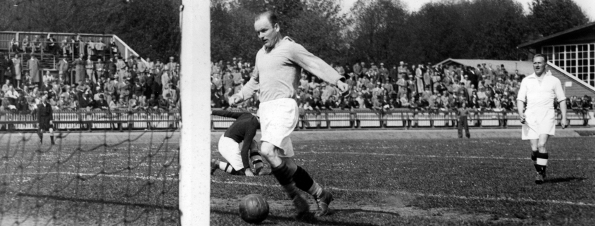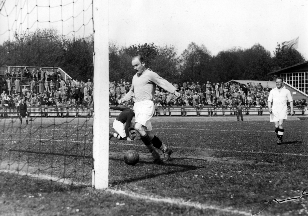 Torsten Brost promenerar in med IFK Malmös tredje mål mot IFK Värnamo. Foto: Otto Ohm/Sydsvenskan/Bilder i Syd 1939