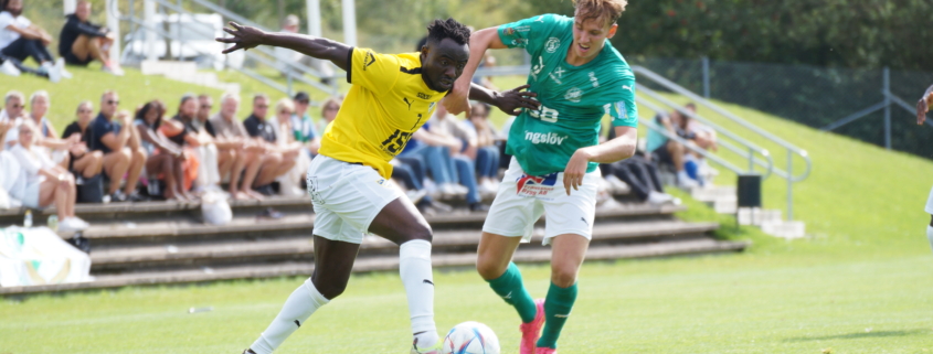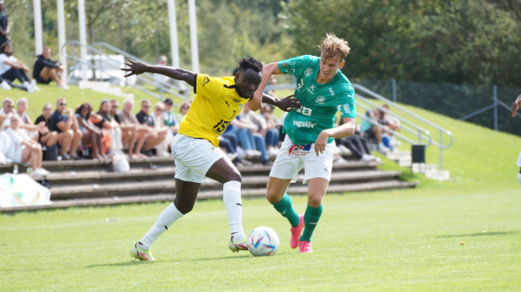 Edafe Egbedi i kamp om bollen med en spelare i Hässleholms IF. Foto: Ibrahim Miftar