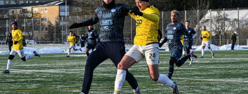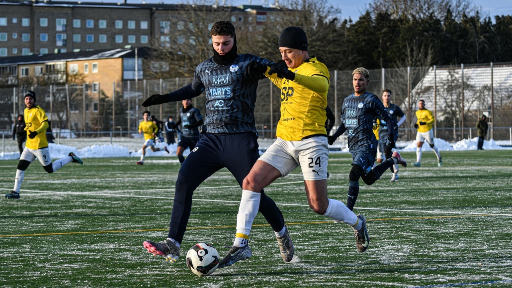 Full fart i vinterkylan. Bosnien Hercegovinas SK:s Benjamin Gashi och IFK Malmös Mahdi Noori i kamp om bollen. Foto: Ibrahim Miftar